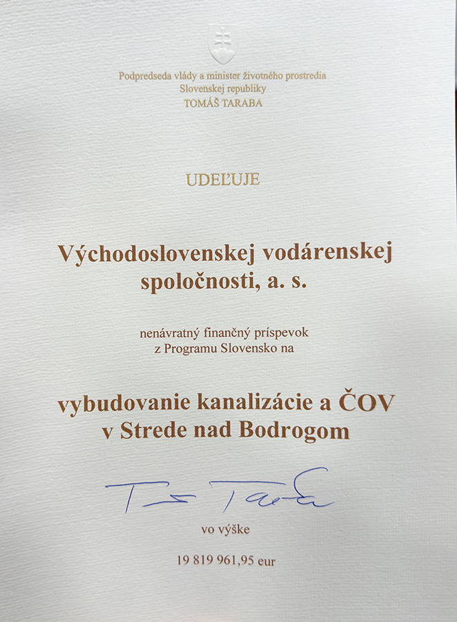 Takmer 2 500 obyvateľov obce Streda nad Bodrogom získa prístup ku kvalitnému a bezpečnému odvádzaniu a čisteniu komunálnych odpadových vôd. Projekt výstavby novej splaškovej kanalizácie a čistiarne odpadových vôd realizuje Východoslovenská vodárenská spoločnosť, a.s., s podporou Ministerstva životného prostredia SR.